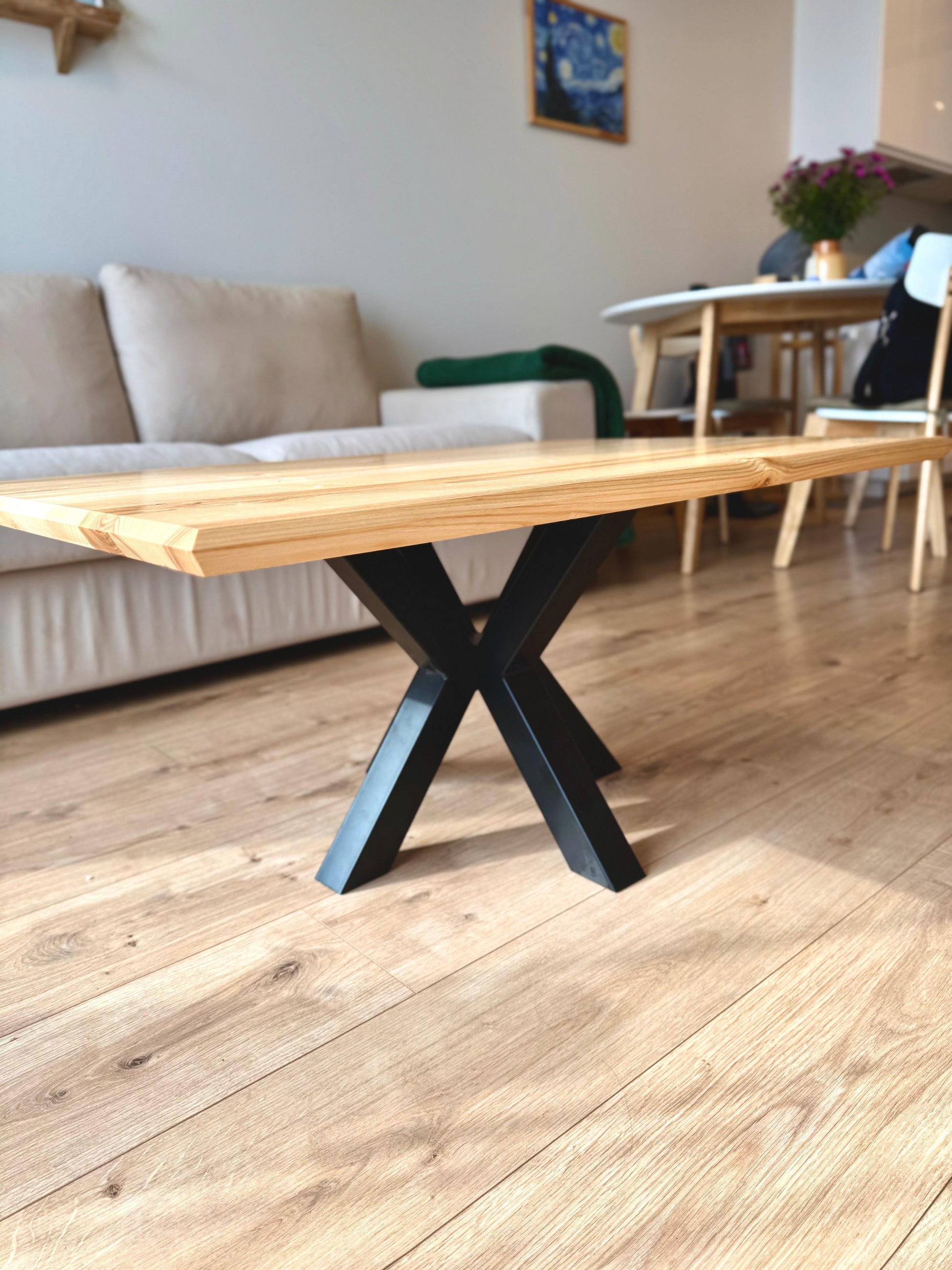 Elevate your living space with this handcrafted ash wood coffee table, designed to blend natural warmth with industrial strength. The solid ash tabletop (28mm thick) showcases a smooth, natural grain that adds timeless elegance to any interior, while the sturdy powder-coated metal legs ensure durability and modern style.